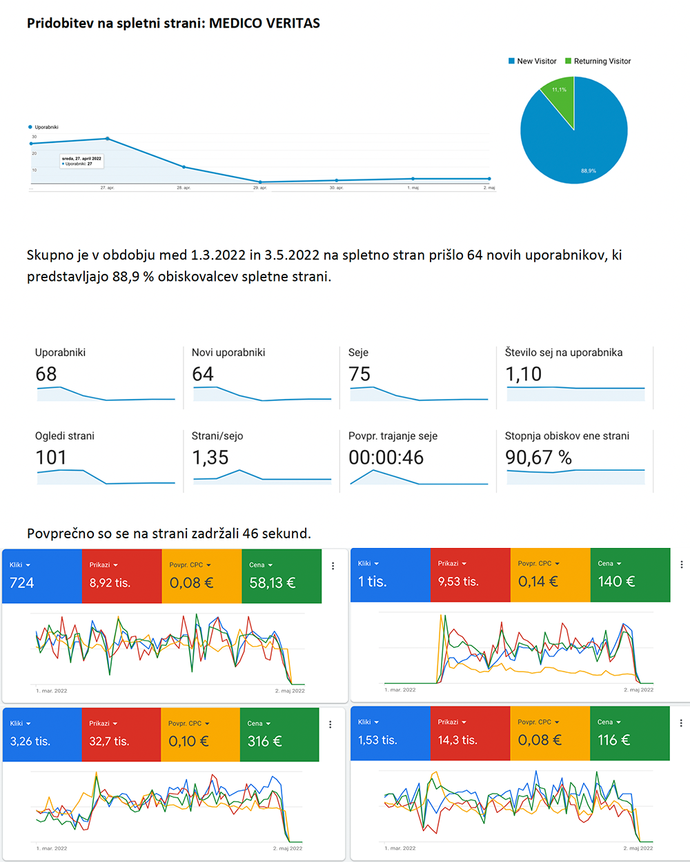 Izvedli smo ciljno u smerjene kampanje digitalnega marketinga in oglaševanja na platformah Meta in Google, s ciljem povečanja vidnosti, pridobivanja pacientov in promocije ključnih storitev.